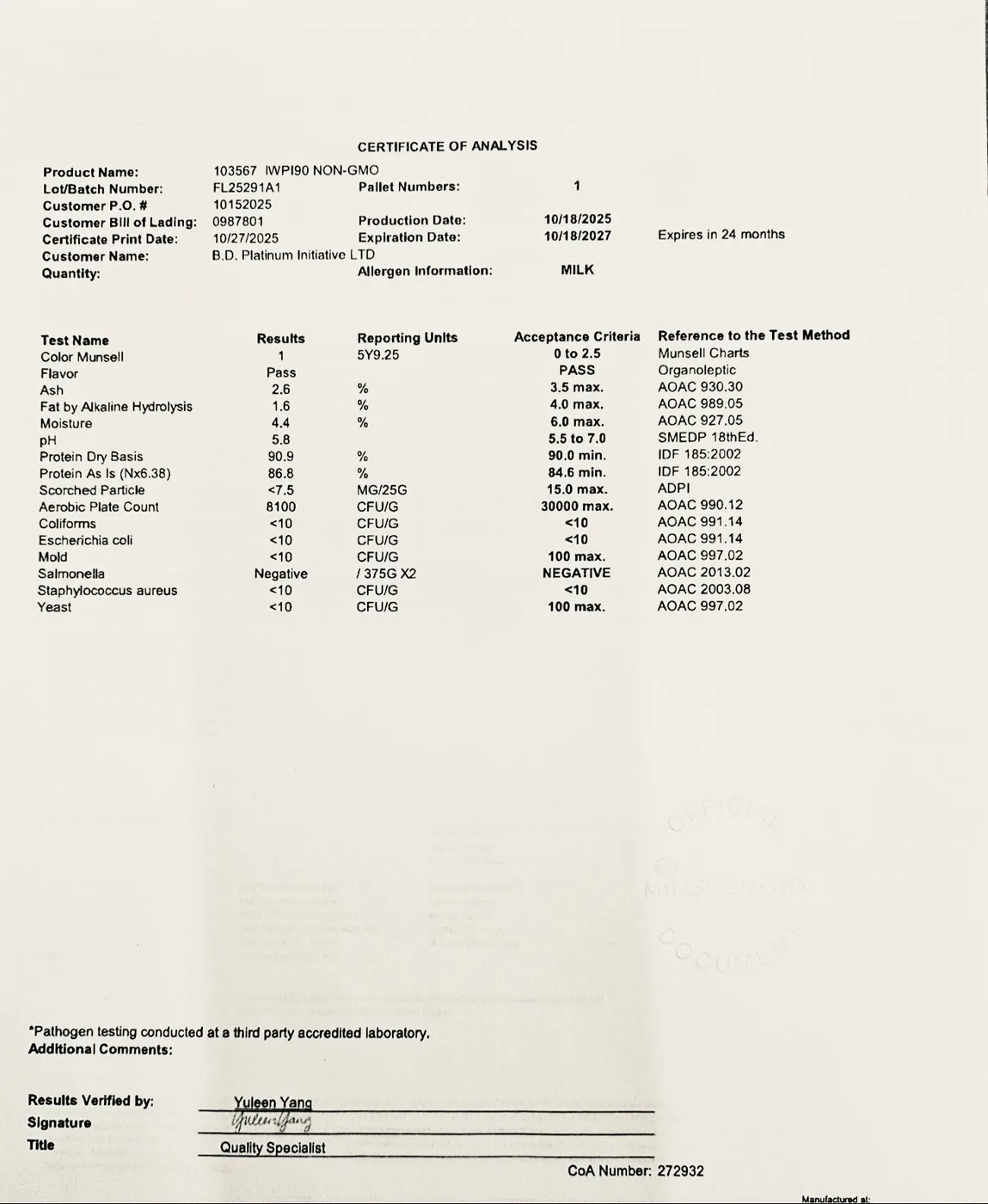 CERTIFICATE OF ANALYSIS
